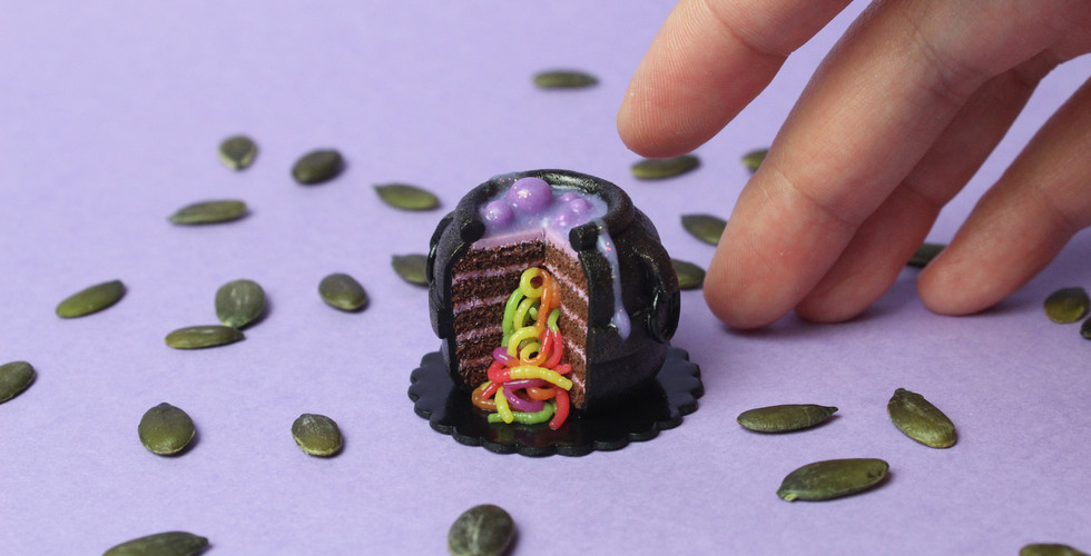 I'm very happy to announce that a few months ago I worked on a project for Dolls House & Miniature Scene magazine, more specifically a miniature witch's cauldron cake tutorial for the October issue.